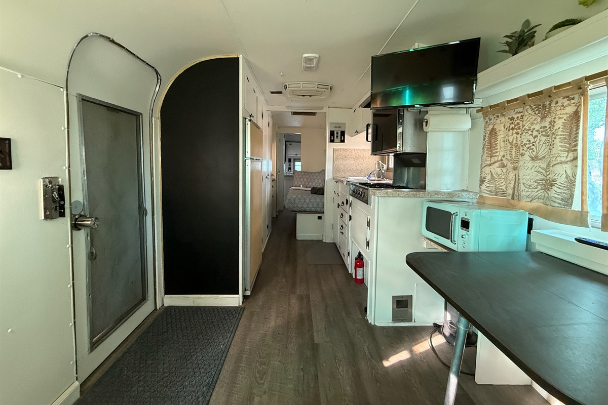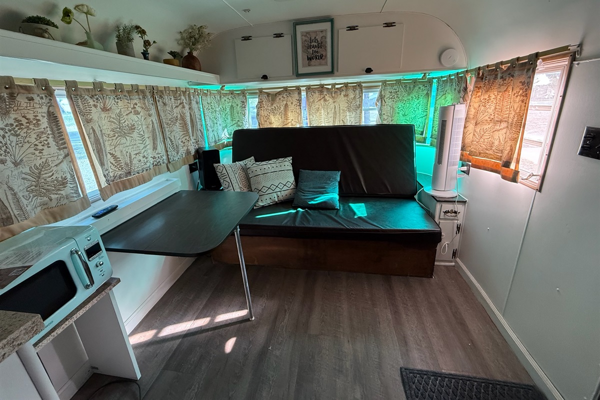 This retreat features two eclectic kitchens, complete with a stove, microwave, and refrigerator. With a maximum capacity of eight guests, unwind in the bedroom furnished with a queen bed, while additional sleeping arrangements are provided by the convertible sofa bed in the living room. Indulge in the stylish bathroom with a shower and enjoy the cozy ambiance maintained by air conditioning throughout the home. The second camper offers two twin beds, kitchen, living room with sofa bed and bathroom with shower.